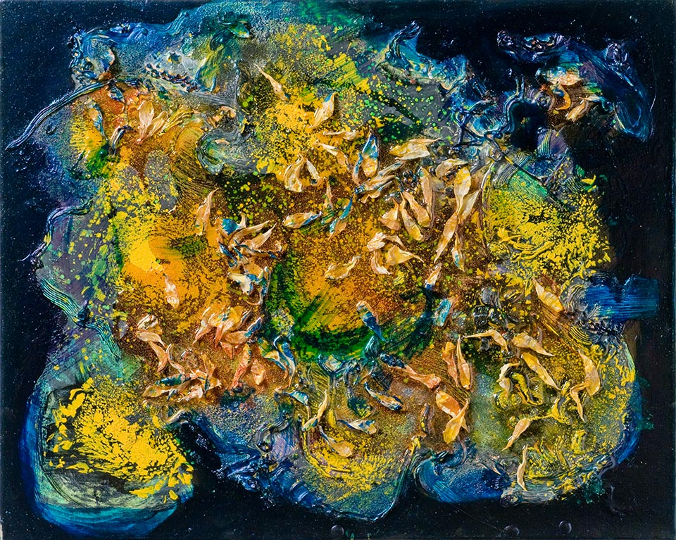 Oil paint, sunflower petals and resin on linen