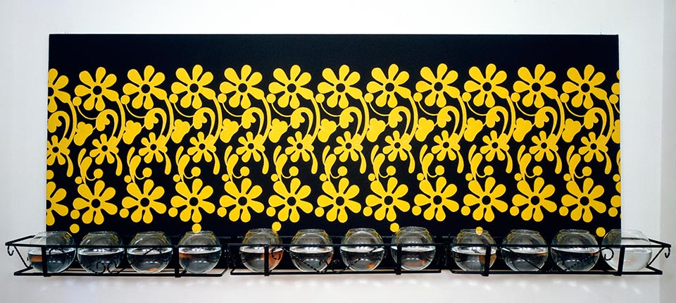 Felt, glass and gold fish 45x126x12” | 114x360x31cm