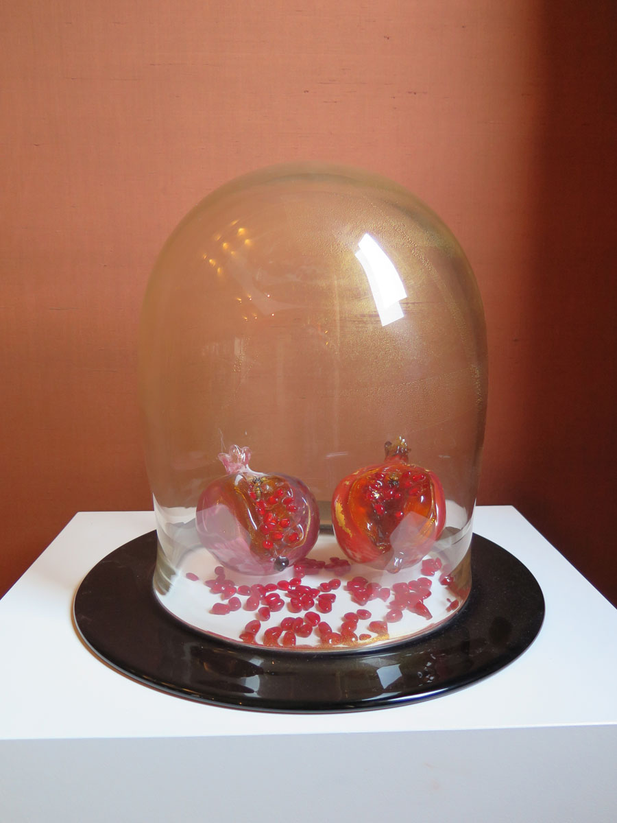 Abundance, 2017, two Pomegranate glass sculptures, 7" x 4" each (18 x 10 cm), w/Murano glass bell jar, bees, 1.5 X 0.5 cm | 0.5 x 0.25 in. seeds
