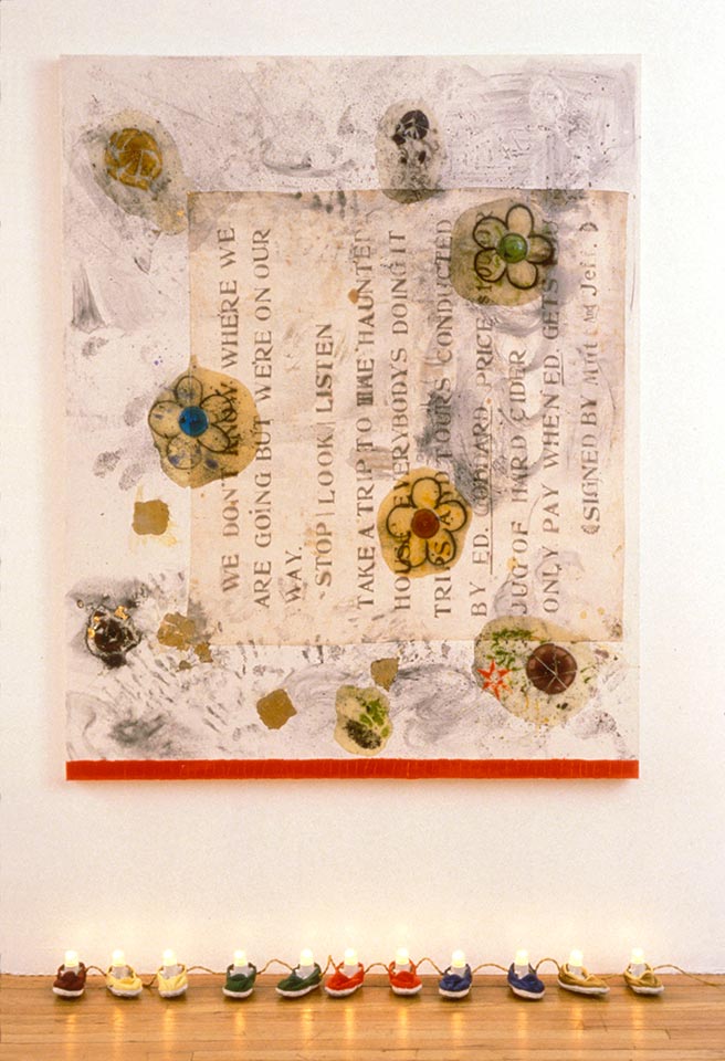 Ashes from Venice Theatre fire, venetian glass, fabric, oil paint and resin on linen, velvet venetian slippers, silk wire and bulbs.