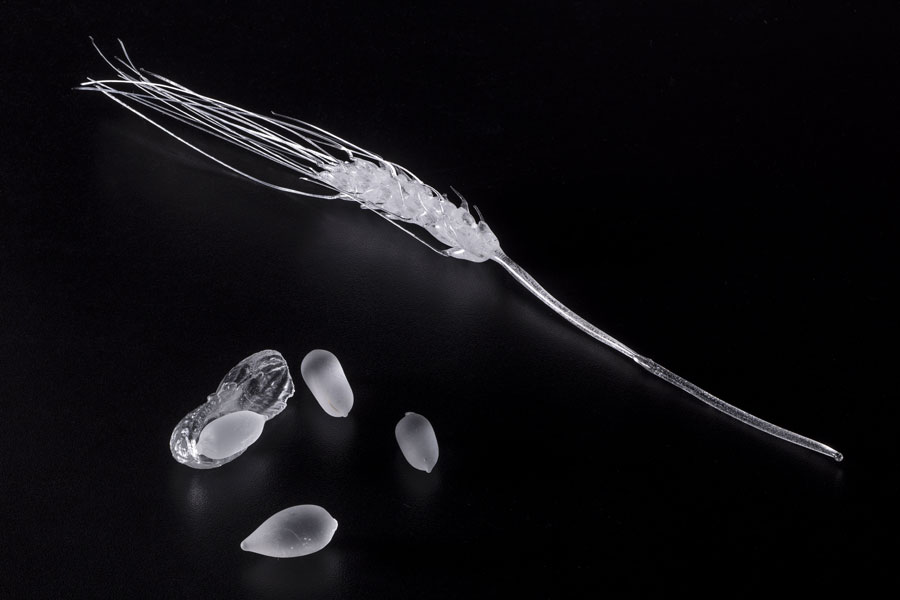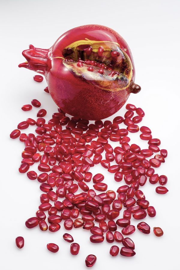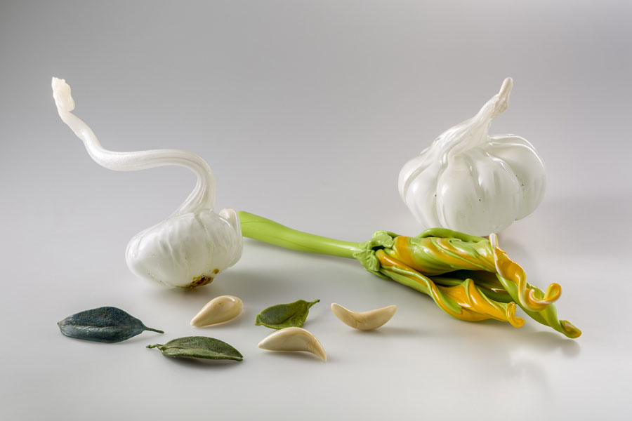 The work is also inspired by global seed banks, like the world’s largest, the Svalbard Global Seed Vault in Norway. Harvest created over 150 different glass seeds, plants and flowers to highlight the beauty, purpose and sacred symbolism of seeds and vegetables. She showcases the beauty of a glass artichoke or pomegranate seed, but also the intricate artistry that glassmakers practice to create form and reimagine nature. Her work is a comment on how global demand for foods or spices is unrealistic, damaging to nature’s seasonal order, and ultimately a threat to the bees that pollinate the world’s crops.