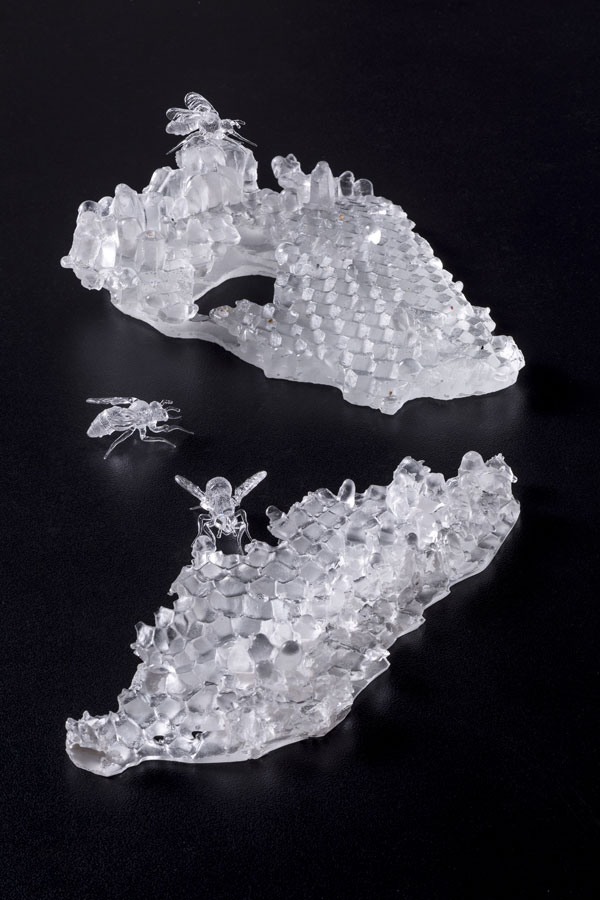 For PROPAGATION, Harvest worked with seven Murano glass masters, employing three ancient and challenging Murano glass techniques: cera persa (lost wax), lume (flame work), and soffiato (blown). For over forty years Harvest has lived, worked and exhibited her art in Venice. She worked for the last 28 years in a Murano glass factory owned by Giorgio Giuman, which went from employing 75 people to a mere four. She began to see parallels between the disappearing bees and Murano’s disappearing glass-making families. She has had many exhibitions in Venice, including 2015’s Room of Dreams and her massive 2013 exhibition DENATURED: Honeybees + Murano, for which she created 100 amber toned glass Honey Vessels, other honeybee-related paintings and sculptures, and the permanent installation Honey Garden, a bee-friendly garden which has transformed the grounds of Giuman’s glass factory. The garden is home to six healthy honeybee hives which produce the first Murano honey.